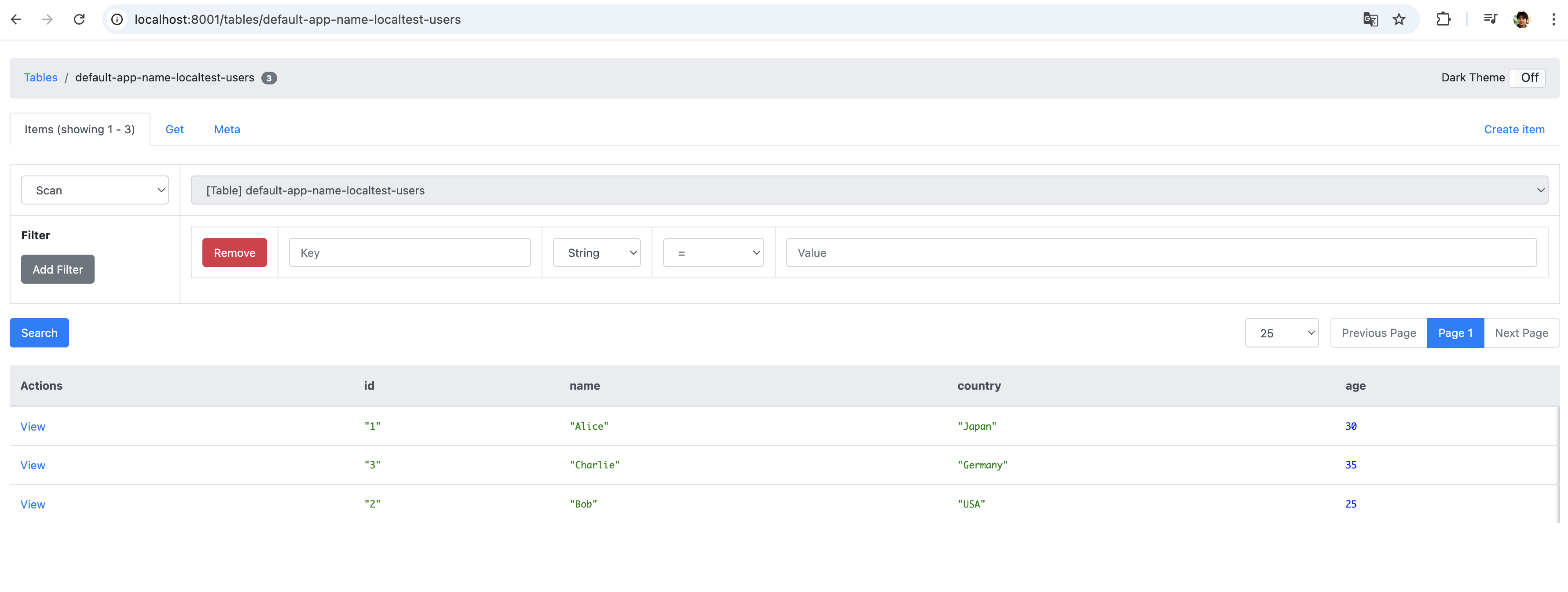 Additionally, the dynamodb-admin container (a GUI tool for DynamoDB Local) is also running, allowing you to view the tables and their contents at http://localhost:8001.