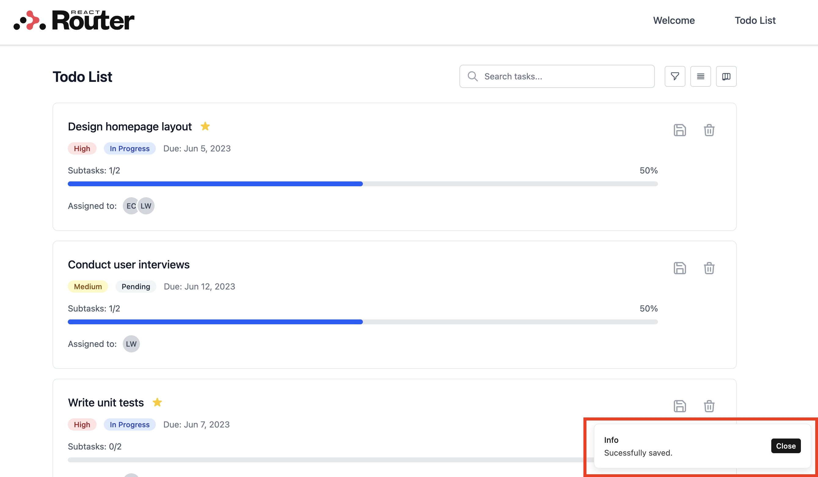 It's also possible to implement WebAPIs using loader/action definitions. Clicking the red-framed area below will display a loader and send a dummy request asynchronously to PUT /todolist