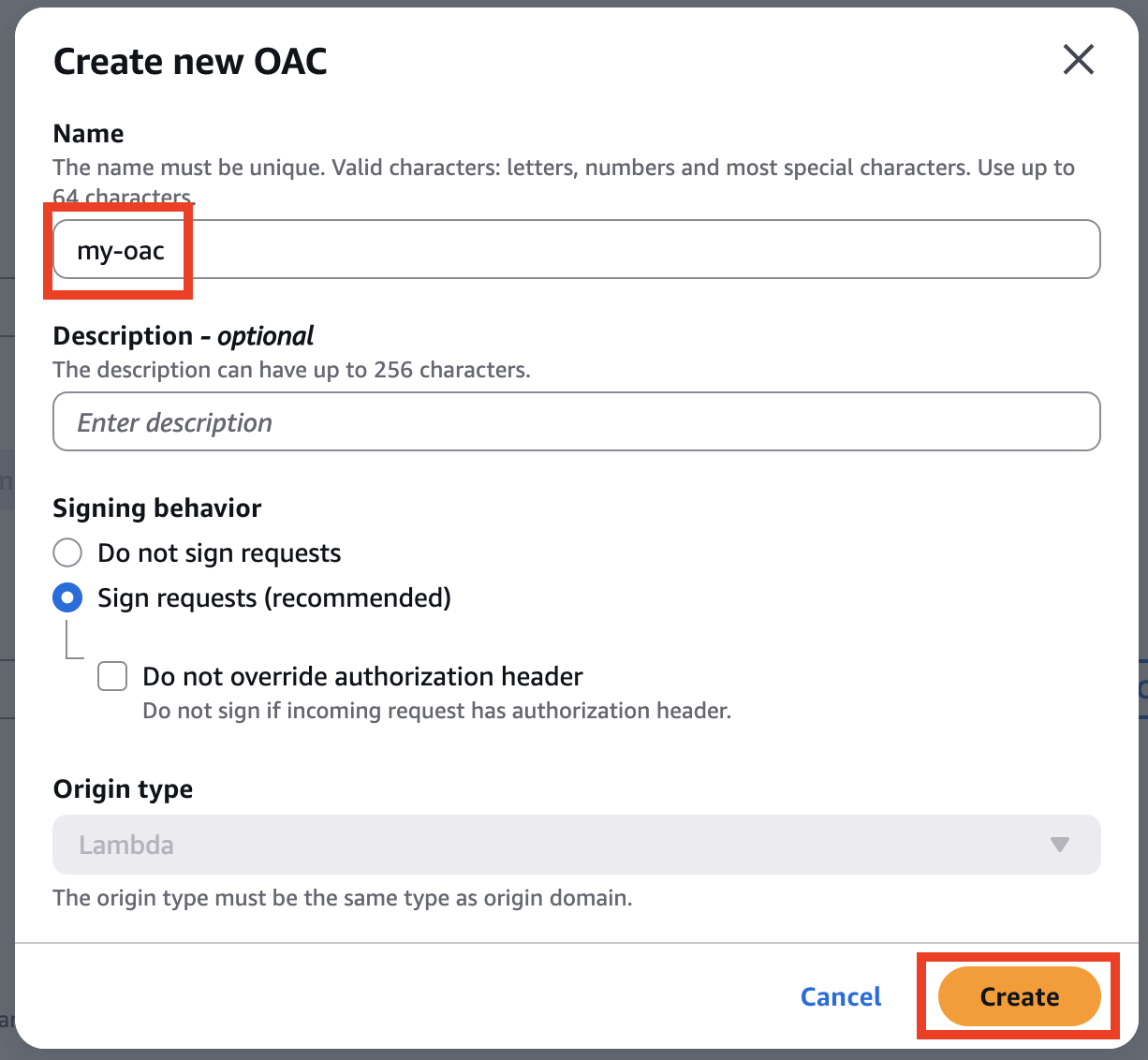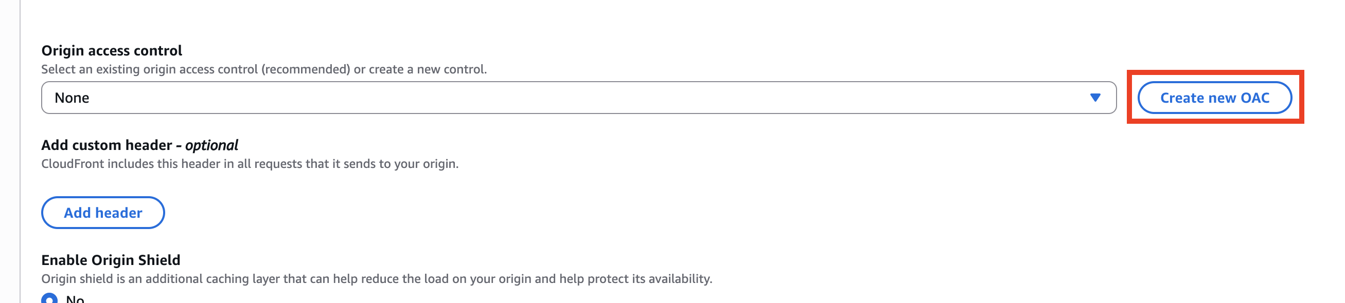 At the bottom of the page, locate the Origin access control menu and click Create new OAC.