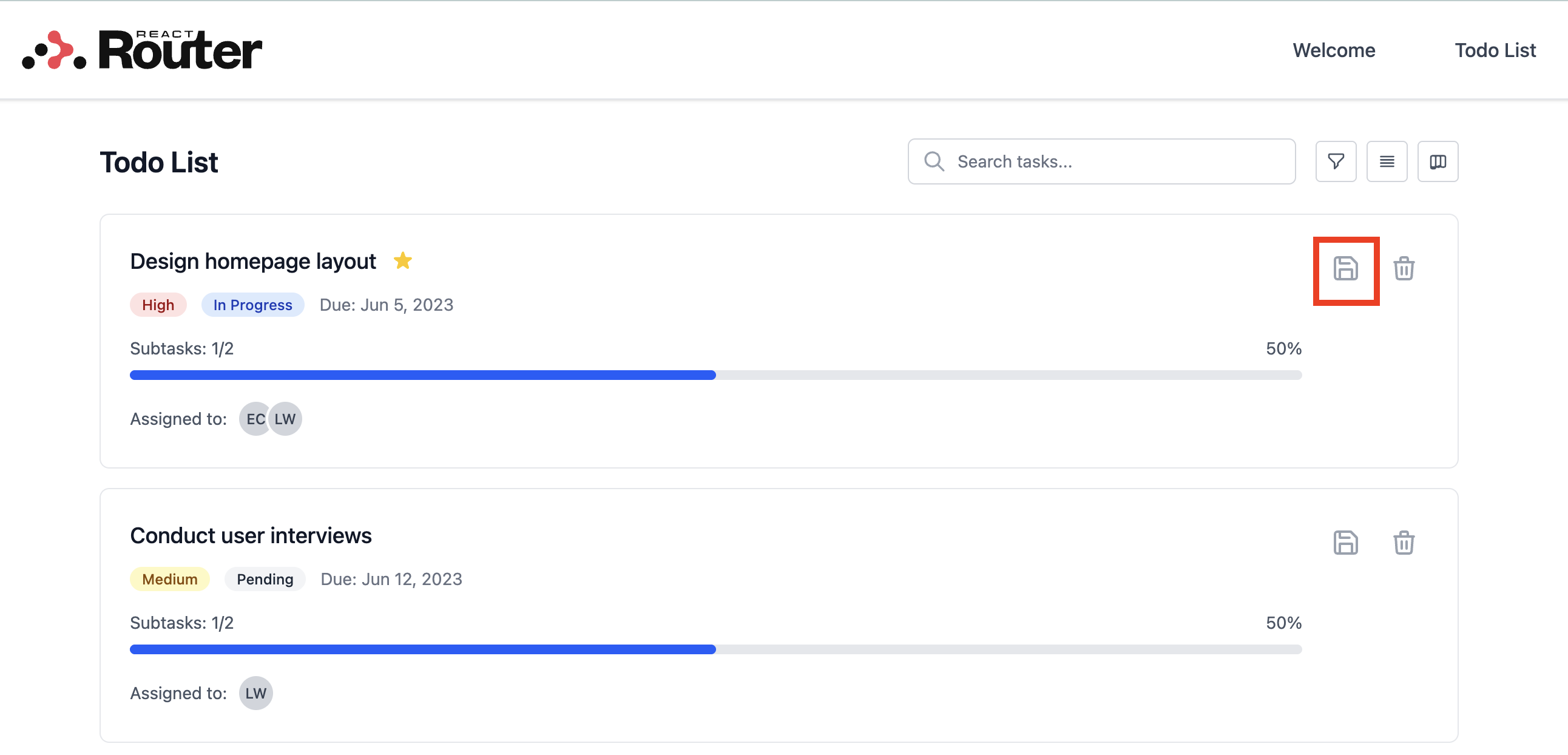 loader / action の定義で、WebAPI を実装することも可能です。以下の赤枠をクリックすると、ローダーが表示され、非同期で PUT /todolist
