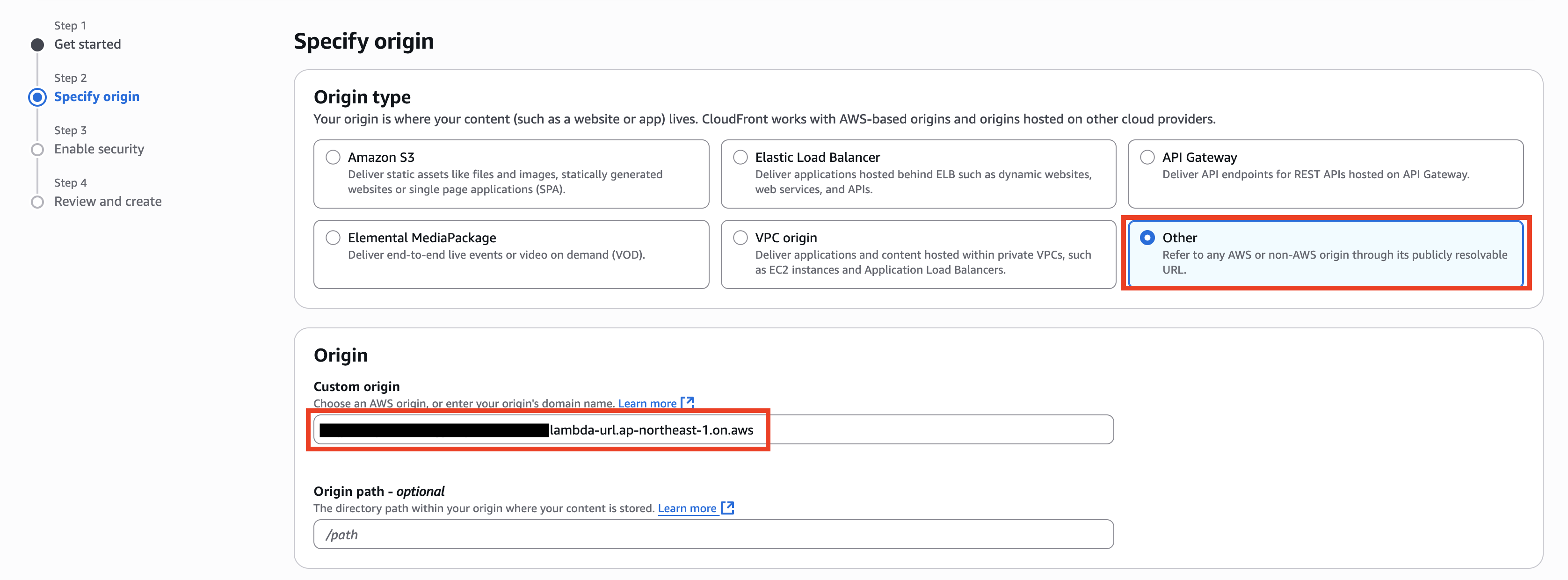 Origin typeにOtherを選択し、Custom Originに先ほど設定したFunction URLを入力して、Nextをクリックします。