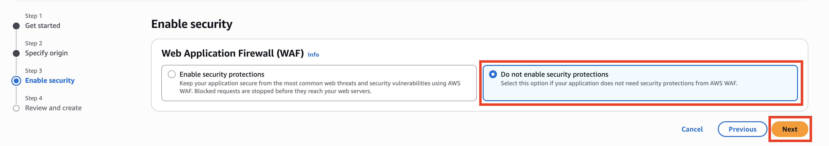 次にAWS WAF入力する部分を以下のように設定してください。WAF の場合は CloudFront を作成した後でも必要に応じて適宜有効にして設定することが可能です(IPアドレス制限・bot対策・各種攻撃に対応できる AWS Managed Rule の設定等が可能です)。