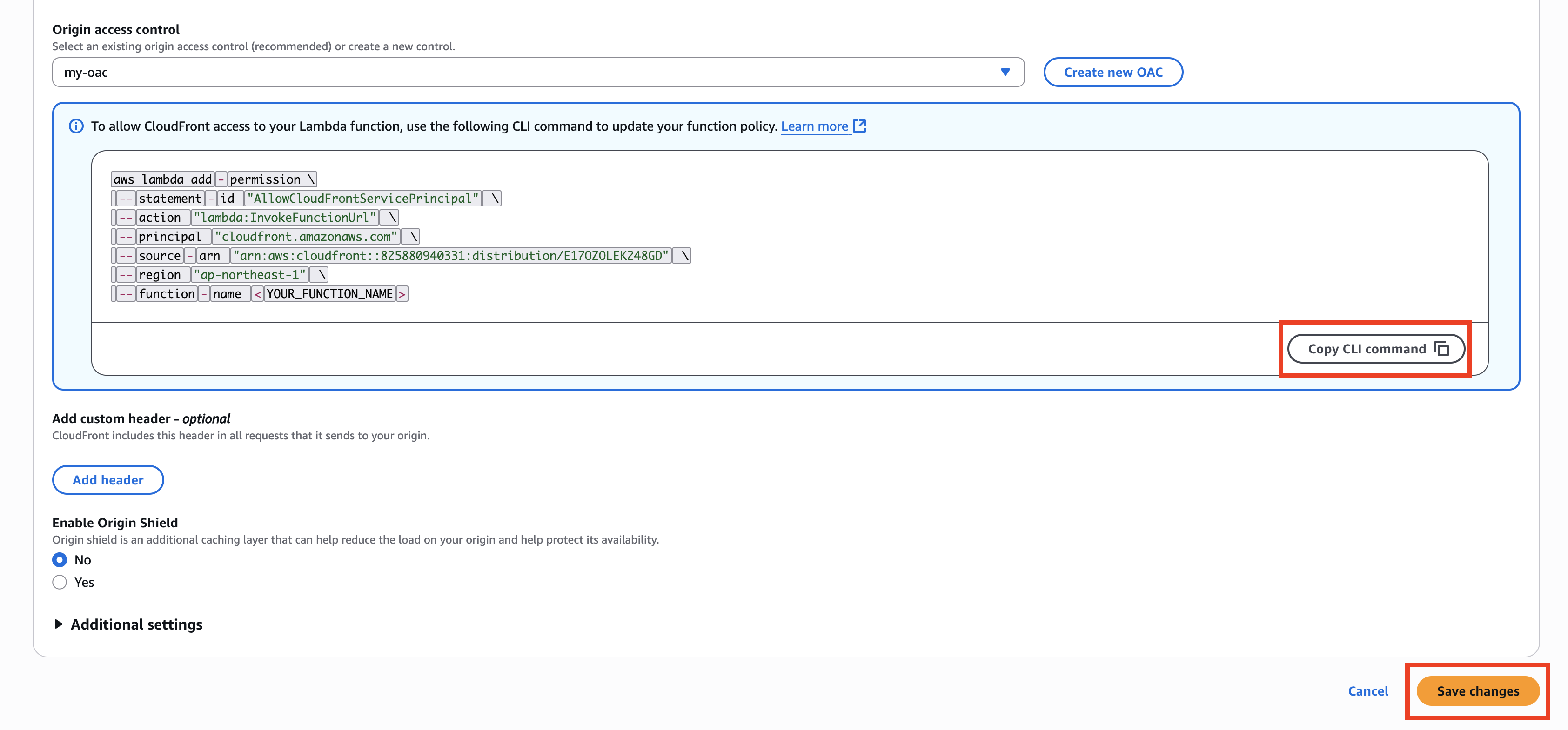 クリックすると元の画面に戻りますが、コンテナイメージを適用した LambdaにCloudFrontからのアクセスを許可するポリシーを付与するためのAWS CLIコマンドが表示されるのでCopyしてからSave Changesをクリックします。